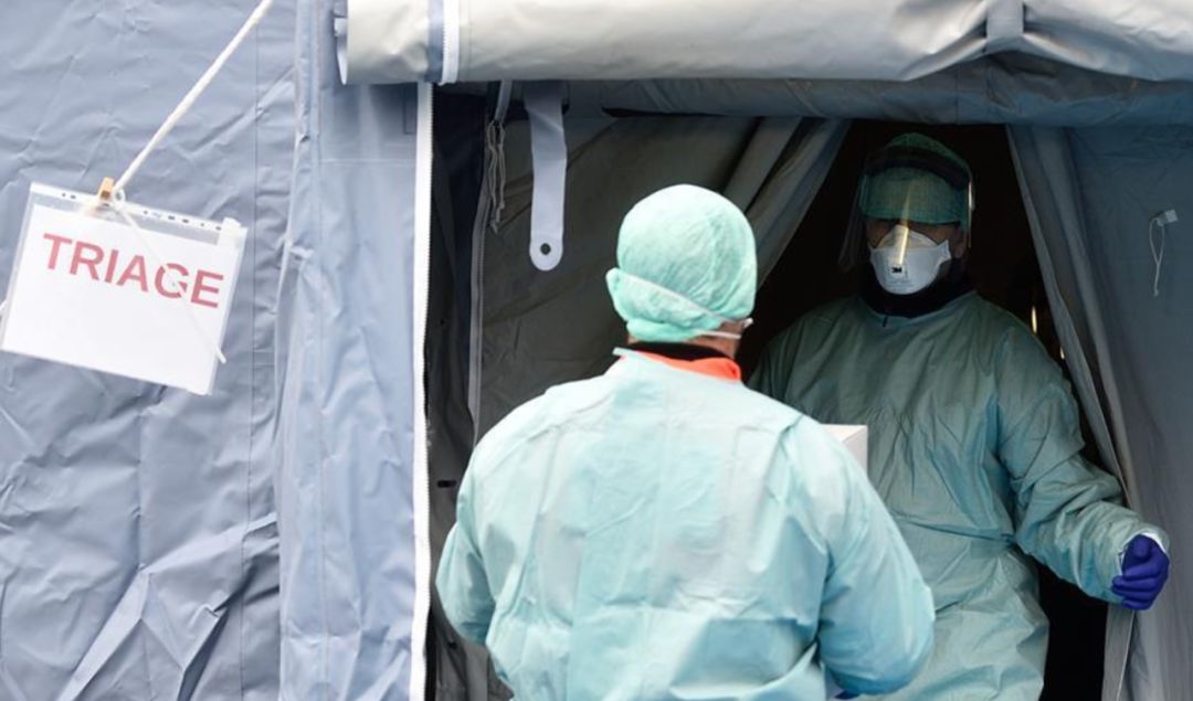 意大利布雷西亚医务人员在医院外搭建的帐篷中工作(图片来源:新华社)